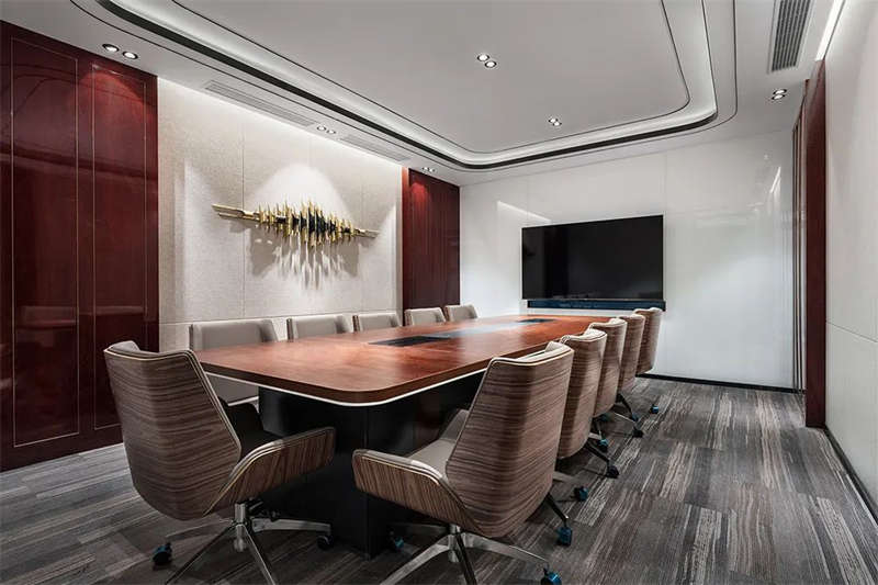 前廳頂部,鏡面質感與光帶反射,使空間得到延伸、重疊呼應,營造出多維的視覺效果,同時打破科技辦公室設計的刻板印象,擁有寬敞開放的前臺設計、待客區,層次、質感、豐滿而厚重。
