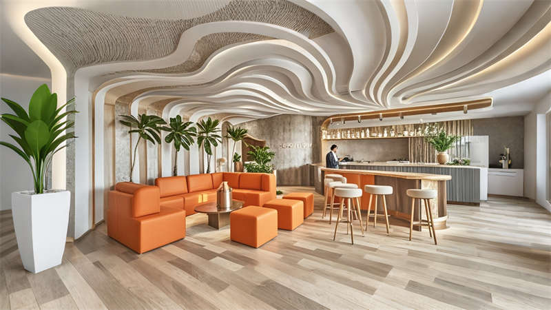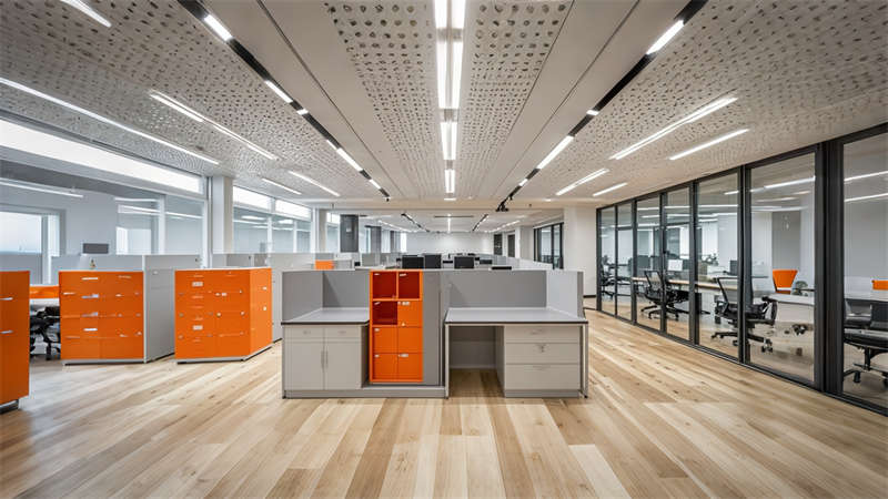 本項目為1800㎡現代簡約風格辦公室整體設計,以 ' 高效?活力?互聯 ' 為核心設計理念。空間規劃采用動靜分區原則,前廳通過淺灰大理石與橙色 logo 的碰撞凸顯企業形象,開放辦公區運用玻璃隔斷保證采光與交流效率。色彩體系以企業標準色淺灰為主調,搭配活力橙點綴,木色中和冷峻感。材質選用環保型穿孔鋁板、防滑地磚和 E0 級板材,集成智能會議系統和隱藏式線管設計。重點空間如高管辦公室采用深胡桃木提升質感,休息區通過波浪吊頂和模塊沙發營造輕松氛圍。照明系統采用 4000K 色溫 LED 線型燈帶,搭配局部裝飾吊燈,確保工作照度與空間美感平衡。全案貫徹人體工學設計,預留 20% 彈性空間適應未來發展需求。