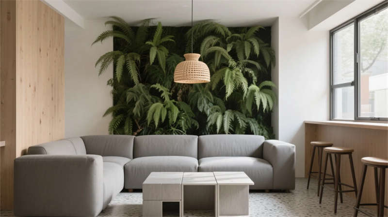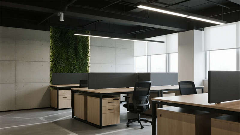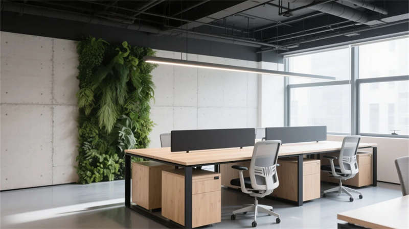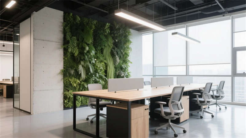 該空間以"自然共生"為脈絡(luò),將輕工業(yè)基因與生態(tài)美學(xué)深度融合。裸露結(jié)構(gòu)的天花與溫潤木元素形成張力,貫穿各區(qū)域的垂直綠植墻如同呼吸脈絡(luò),賦予嚴(yán)謹(jǐn)辦公場景盎然生機(jī)。