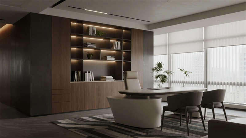 開放辦公區(qū)依托巨幅落地窗引入自然韻律,升降工位與模塊化家具賦予空間彈性;獨(dú)立辦公室通過垂直百葉調(diào)節(jié)光影私密性,暗藏式書柜燈光烘托沉穩(wěn)氣質(zhì)。核心協(xié)作區(qū)打破傳統(tǒng)封閉模式,弧形沙發(fā)與可書寫玻璃墻激發(fā)即興創(chuàng)意,而茶水間綠植墻與城市景觀吧臺,則在高效節(jié)奏中注入呼吸感。