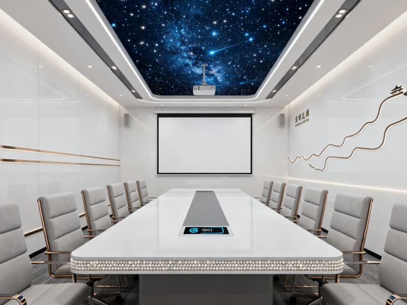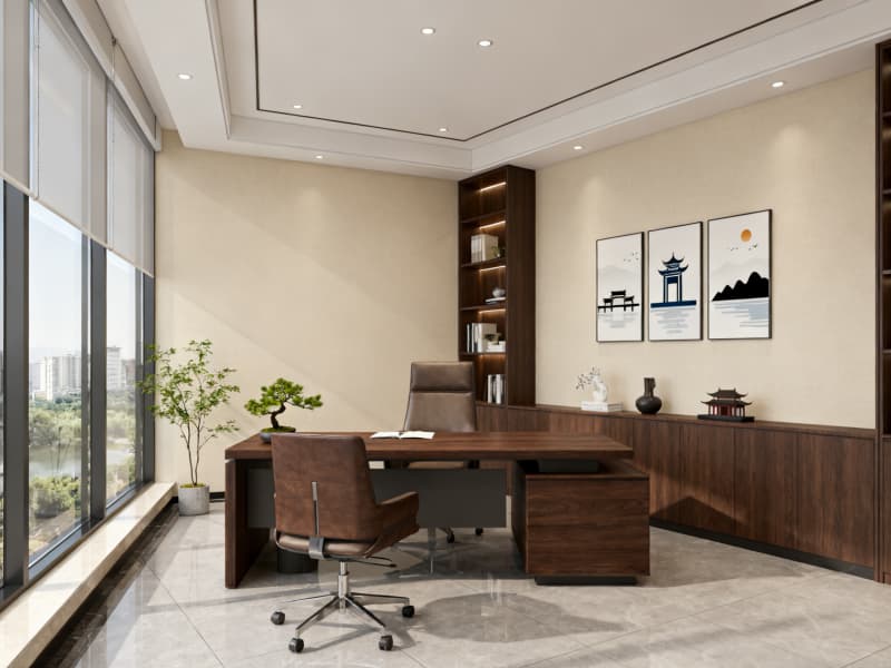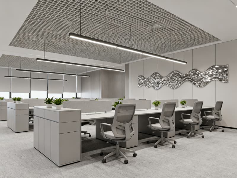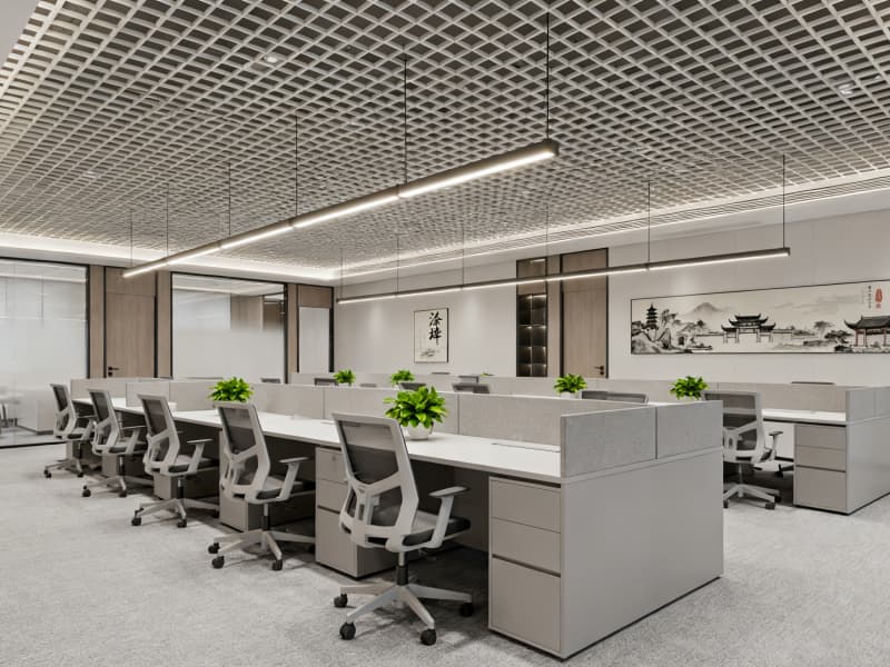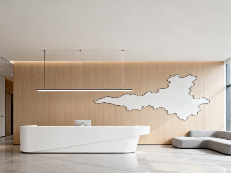 本設計以滿足辦公功能需求為核心,融合現代簡約風格與蚌埠地域文化元素,打造兼具實用性與美觀性的辦公空間。整體空間色彩以淺色系為主,搭配深色點綴,營造清爽、舒適的視覺效果,同時通過落地玻璃窗、線性吊燈等設計引入充足光線,減少空間壓抑感。?