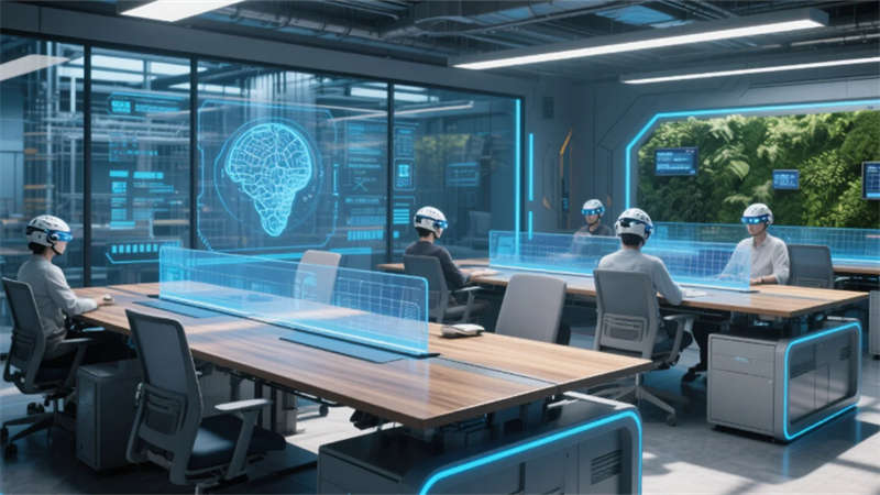 生態基因貫穿每個細節:光伏連廊的遮陽發電結構隨日照角度變幻肌理,雨水回收裝置化作中庭的液態雕塑,木紋鋁材桌面流淌著實時產能數據。智慧會議室的聲學穹頂折射出數據暴雨,玻璃幕墻在沙漠與極地場景間瞬時切換,腕表投影界面與全息沙盤構成決策中樞。