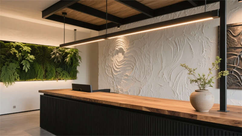 步入大廳,弧形亞麻沙發與編織地毯圍合出松弛場域,整面落地窗借景庭院竹影,琴葉榕與懸浮綠植墻形成立體生態敘事。多功能區以巢湖水波紋地毯呼應地域脈絡,壁爐旁的非遺火筆畫裝置暗藏城市文化密碼。咖啡吧藤編座椅與水磨石臺面碰撞,幾何綠植墻在百葉光影中演繹晨昏詩意。