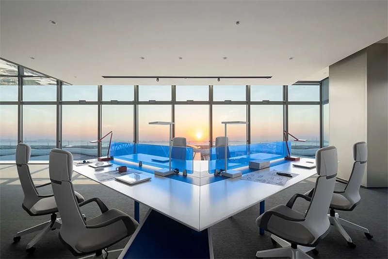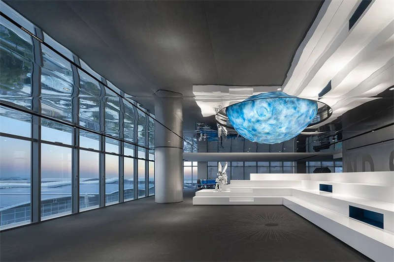 室內空間由功能家具和裝置形成自然分隔,空間整體因祛除隔斷而產生了流動,這與科學巨匠斯蒂芬·霍金的宇宙觀具有一種相通性。太空兔和隕石一起來到這里,被安置在接待臺和會議室中,向來訪的人們講述宇宙的故事,猶如那些激動人心的創業事跡一樣,源于有限的奇點,產生突破界限的無窮能量。