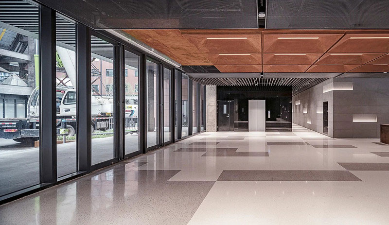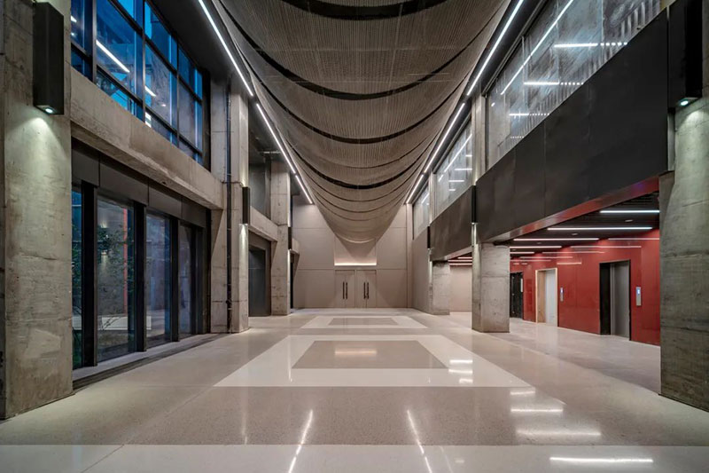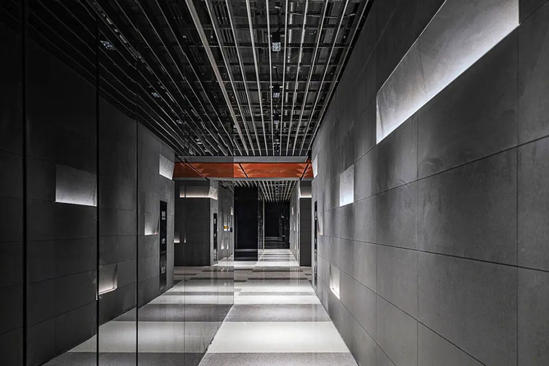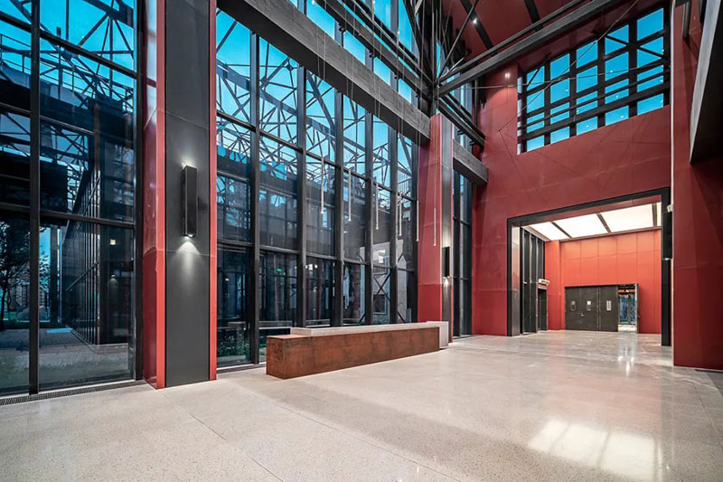 低飽和度紅色鋼板與黑色鋼板形成視覺碰撞,銹板前臺(tái)、懸浮燈飾與金屬結(jié)構(gòu)架讓空間闊達(dá)簡練,通高的玻璃幕墻借景舊建筑的殘影,使之成為室內(nèi)裝飾的一部分。