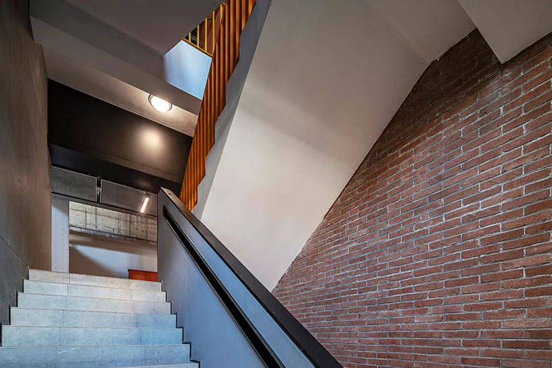 室內(nèi)空間造型多以棱角分明的幾何形體為主,減少裝飾類細(xì)部,鐵銹褐、水泥灰、煙熏黑等暗冷色調(diào)元素交織在一起。局部通過紅磚作為點(diǎn)綴,減少淺色系材質(zhì)的使用,讓自然光線將空間變得更有質(zhì)感。