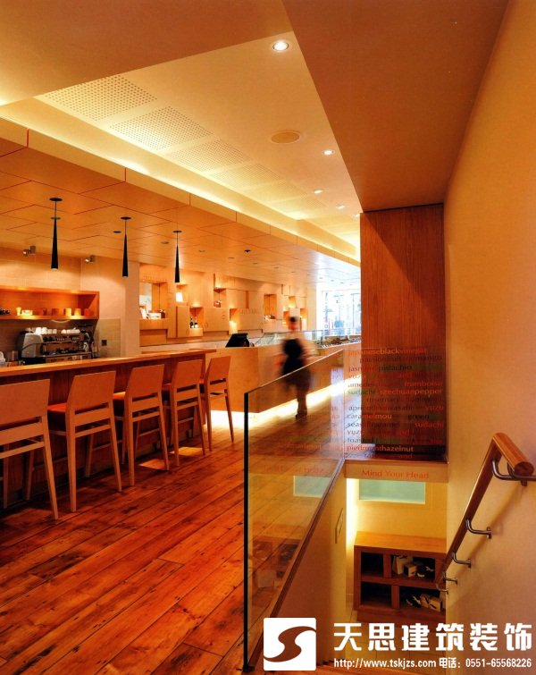店鋪后部特別定制的玻璃吊燈象征著可可豆的豆莢。其他的設(shè)計(jì)元素包括回收的松木地板、石灰石柜臺和臺面、鮮橙色皮革、橡木制品以及長條噴漆天花板。北京餐廳設(shè)計(jì)師在處理天花板時(shí),將不同的元素統(tǒng)一在一起,突出了空間的長度并將人們的眼球吸引到店鋪后部。地下室主要是用來展示的廚房,里面設(shè)置著巧克力制作課程和工坊。