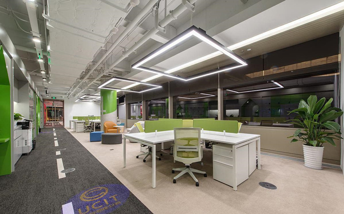 2、該辦公室裝修項目主要是使用者作為科技類產品的研發空間,要求足夠寬敞,空間的開放度與靈活度自由變換,辦公桌實現可隨意拼裝組合。設計師在設計上立足于;靈活共享的主線,以設計、現代、開放和連通為主題,著眼于科技發展的今天和未來,創造出一個極富時代感和超前性的辦公空間。整個辦公空間以白色為基底色,輔以藍色的協調、中和,黑、 白、藍成為標準層的主色系,完美將辦公層的空間格局進行分割,營造出現代簡約、自由開放的高端科技感。長方形燈具應用突出了現代科技的嚴謹態度,極大凸顯企業的文化感與產品前沿的設計感。會議室根據實際需求,實際軟裝時則以多彩元素為主題,一眼望去 ,布滿了明快的顏色 ,活潑卻不繁雜 ,采用的半透明亞克力玻璃椅是點睛之筆,帶給空間無限的靈動感。黑板漆墻面設計則豐富了使用者的功能需求,達到裝飾和功能并存的目的。靈活的辦公桌還可自由變換,滿足不同需求的會議要求。