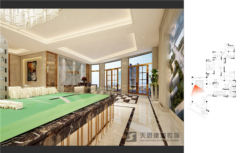 明確功能區(qū):售樓處的各個功能區(qū)應(yīng)相對獨立,不能給人“空間復(fù)雜”的混亂感。設(shè)計時,不能忽略門口、外圍、樓道等外部空間。