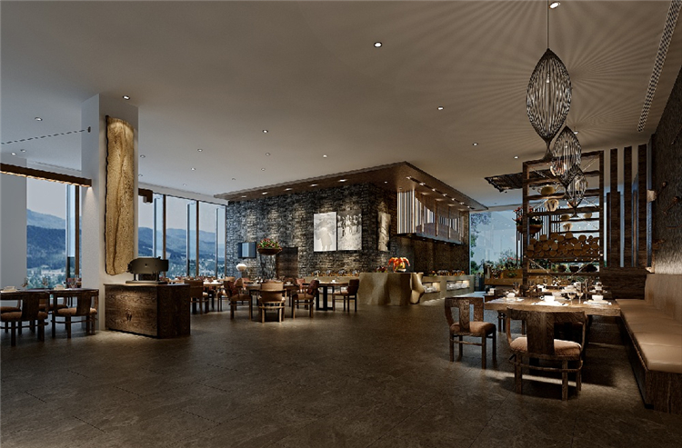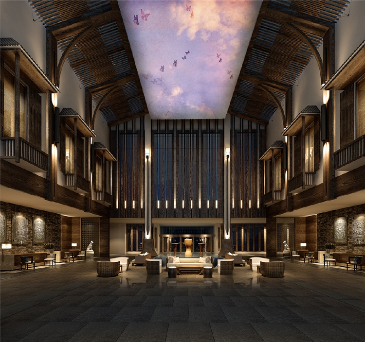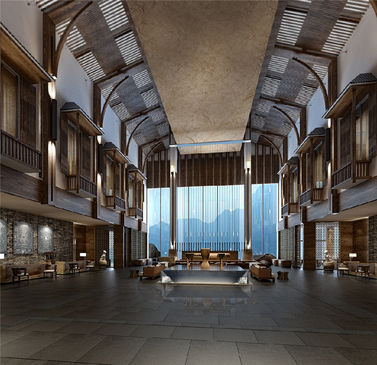 本案度假酒店的室內設計靈感來自于瑤族民居的生活態度,并結合對大自然的尊重,運用天然素材以當代風格重新演繹傳統設計。山水表現“瑤美”,鼓火表現"瑤情”,圖騰犬則表現“瑤魂”。以盛大的篙火晚會為藍本。融入舞臺和展示空間的概念。以此增加戲劇化效果。提升賓客對空間的精神感知。