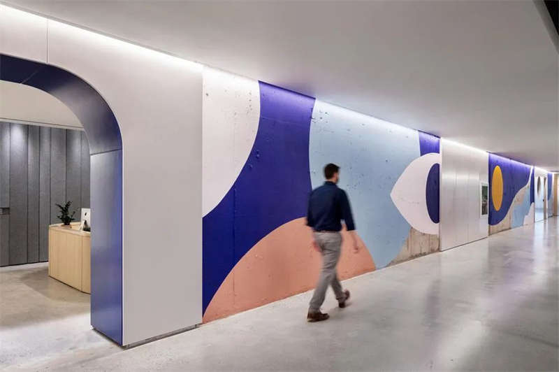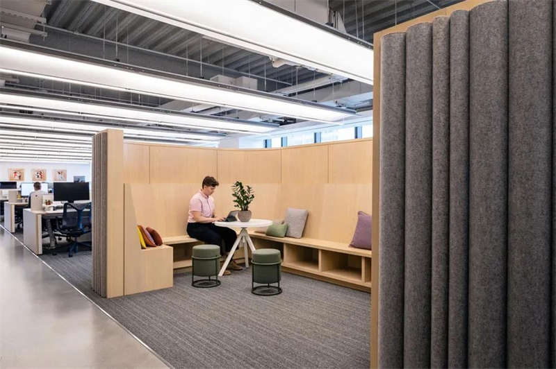空間的聲學設計也經過專業團隊的仔細考量,以確保靈活的協作空間具有吸引力、舒適性和高效生產力。各種類型的會議空間從大型會議室到全面毛氈飾面的靜音“工作艙”;在辦公桌上方,采用了定制的聲學毛氈弧形擋板集成照明裝置,由此優化開放工作區的聲學效果。
