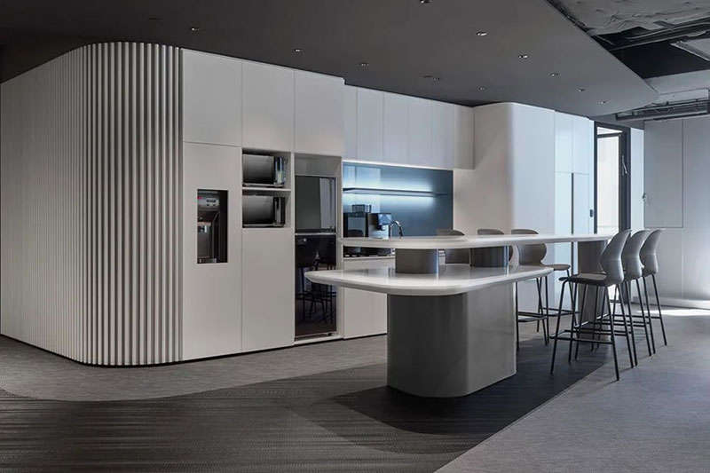 由于建筑不是專業寫字樓,全開放的租賃面積、過大的柱體、凌亂的工業管道天花也給設計提出了難題。為了平衡好行政辦公和會客及不同部門之間的功能分區,設計師把打印、咖啡、小洽談休憩空間作為功能島置入整層的正中,合理分隔東西兩個工區并方便大家便捷使用。沿窗的柱體通過裝飾面的包裹和扭轉形成空間亮點,輔以休閑家具,簡短的洽談分享、小的會議討論在此得以解決,員工在介于室內空間和自然窗光中獲得了獨特的體驗和助益。