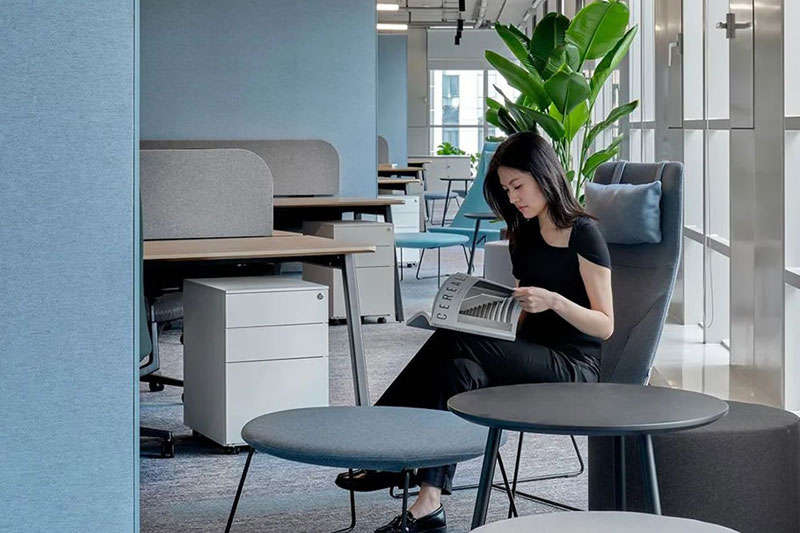 入戶的觀感尤為純粹,由一面數碼互動墻將視覺由電梯廳引入內部,極致的暗調勾勒出明快的線性淺灰色logo墻并有向上延伸之感,自發光logo猶如秘境中的湛藍熒光寶石恬靜而自信的展現自我,黑色Bolon毯紋理隨著視覺的變化不斷變幻伴隨空間動線,將訪客緩緩引入內場直達休憩區,猶如數字科技傳動向前并引領未來。此處形式多樣的家具配合綠樹盈動,構造了訪客和員工之間交融和平衡的靈動空間。