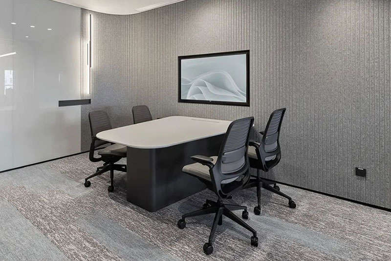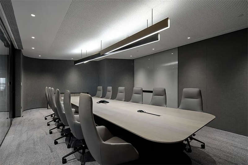進入會議空間,設計師刻意控制它的視覺張力,前區的體驗得以延續,灰黑色調覆蓋目力所及并引入更多的柔性材料,專業、專注是會議空間的功能立本但也不乏我們對活力元素的照拂,每一個會議室我們都選擇了形式各樣的藍色地毯來裝點。