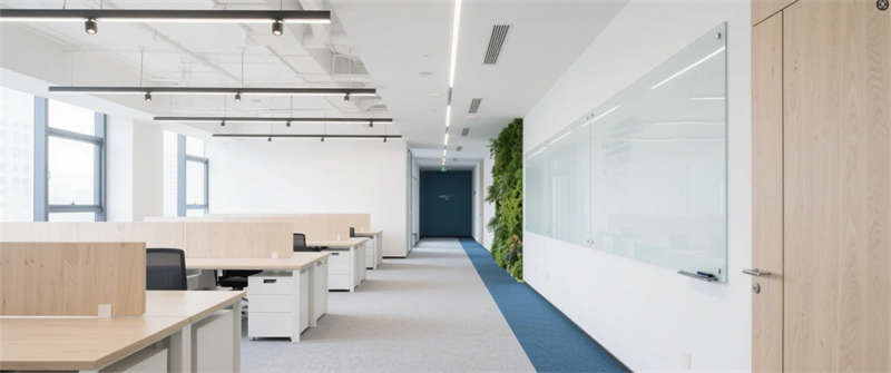 開放式辦公區(qū):北歐風(fēng)工位搭配綠植墻,裸露天花軌道射燈兼顧實用與工業(yè)美感;