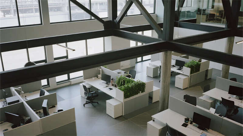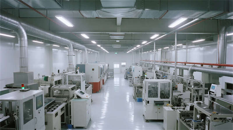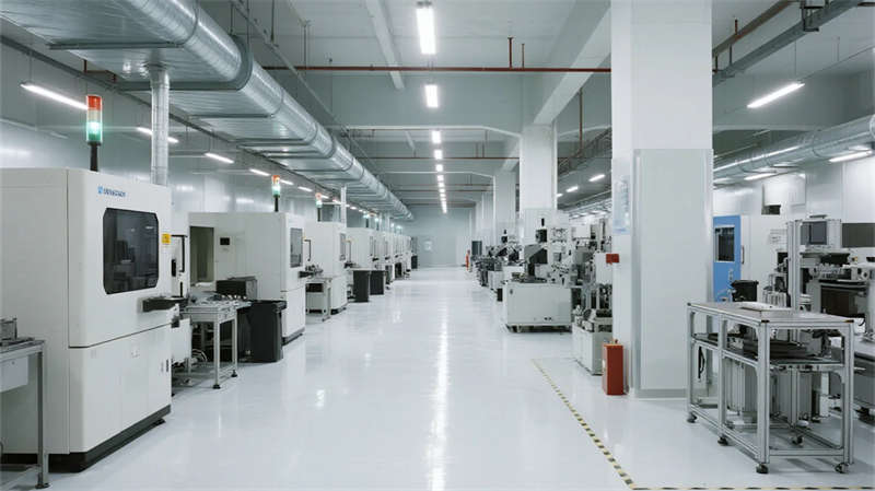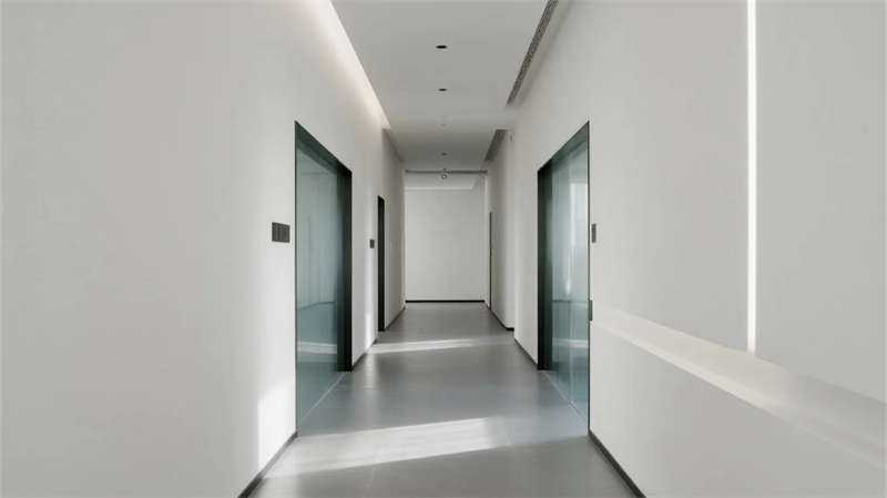 內部空間延續"少即是多"哲學:生產車間以銀白為主調,設備管線規整排布于頂棚,環氧地坪反射線性燈光,營造科技感十足的無塵環境;辦公區突破傳統隔斷,玻璃幕墻引入外部景觀,綠植墻自然劃分區域,形成通透開放的協作場域。
