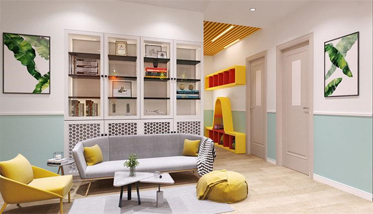 前廳不變的情況下,logo背景墻色調偏重,所以運用了色彩降噪,添加了一些偏冷色調,不僅能夠提升整個空間的舒適感,還能給孩子一個安全、放松的空間。結合了logo的主色調,再進行色彩搭配可以形成歡快、親切、活潑的色彩氛圍。與此同時還設置了也增加了兩間鋼琴室,提高了空間利用率。大廳玻璃教室內墻面貼了吸音板,一方面體現機構在音樂上的專業性,另一方面就是讓空間的隔音效果做到最佳,讓孩子在學習的時候不受干擾,能夠安靜的學習。