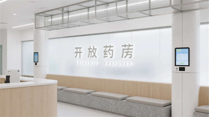 藥房區域的磨砂玻璃與金屬網隔斷,在通透與隱私間取得平衡;急診科模塊化設計確保高效響應,綠植墻緩解緊張情緒。全院統一運用防菌地材、圓角處理及無障礙細節,將安全關懷融入極簡美學。