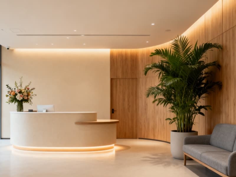 本設計以康養療愈為核心,聚焦休養人群的身心需求,打造兼具醫療專業性與生活溫度的4000平空間。整體風格摒棄冰冷的工業感,以淺米、原木、柔粉等溫潤色調為基礎,搭配柔和的光線與自然綠植,構建舒適安心的環境氛圍。