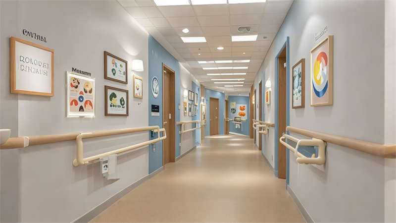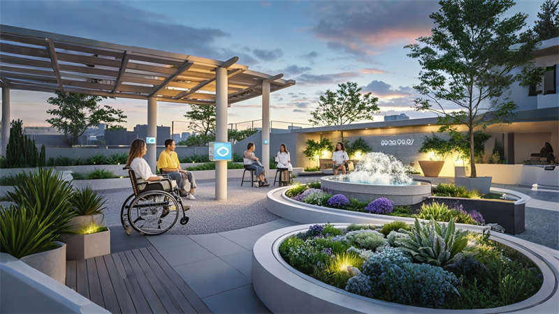 重點區域采用防滑橡膠地板、圓角處理家具、緊急呼叫裝置等 35 項適老細節,照明系統采用 4000K 暖白光搭配智能調光。醫療區設置獨立新風機房,活動區配置體感互動設備,戶外花園集成霧森降溫和夜光導航系統,打造安全、舒適、智能的現代養老空間。