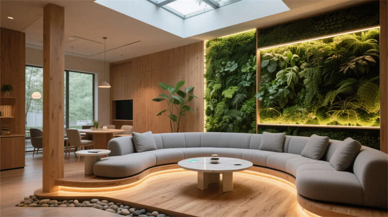 該展廳以“科技與自然共生”為理念,打造具有呼吸感的未來辦公展示空間。暖灰木紋肌理與流動曲線構筑空間骨架,智能光帶如脈絡貫穿始終,在冷調科技感中融入垂直綠植與天然材質,平衡數字時代的溫度需求。