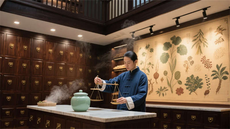 露天庭院白石鋪就太極紋路,素衣身影在紫竹霧靄間起勢推掌,漏窗剪出晨練動態。名醫診室紅木案上脈枕微溫,博古架藥材標本與滿墻醫典沉淀千年智慧。智慧煎藥中心的銅鍋陣列于胡桃木頂下吞吐蒸汽,光影交織傳統與現代。